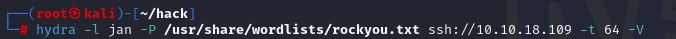 - hydra로 취약한 jan 계정에 대해 무차별 대입 공격하여 ssh 패스워드 탈취