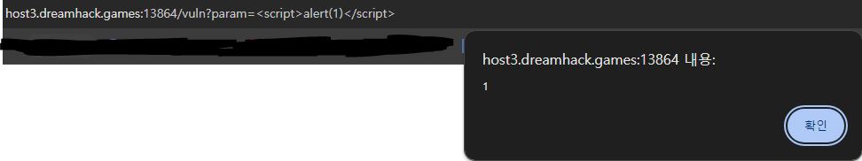 /vuln(xss) page는 접속하자마자 '1' 이라는 알림창이 뜬다. 접속 url을 보면 파라미터 값에 들어가있는 <script>alert(1)</script> 스크립트가 그대로 실행되는 것을 알 수 있다.