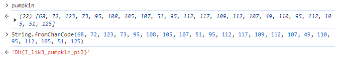 문제를 다 푼 후에 pumpkin에 입력된 배열을 불러온 뒤 해당 배열을 String.fromCharCode를 통해 ASCII 코드로 변환하면 복붙할 수 있는 플래그를 얻을 수 있다.