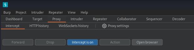 1. [Burp suite 실행] - [Proxy] - [Intercept] - [Intercept is on] - [open browser]