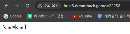 문제 설명은 아주 간단하다 flag 파일을 읽어보라고 한다. 페이지에 출력되는 문구를 보니 cmd 파라미터에 커맨드를 입력하면 그대로 실행되는 것 같다.