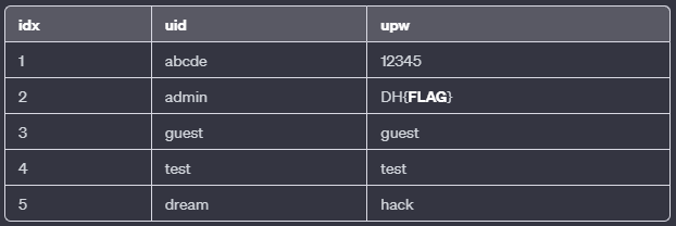 INSERT INTO user(uid, upw) values('admin', 'DH{**FLAG**}');