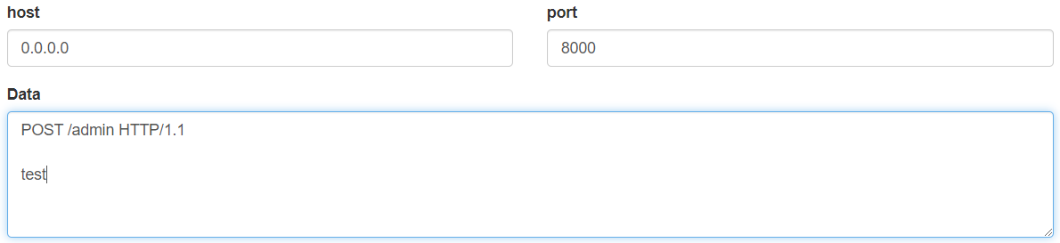 port는 소스코드에 적힌대로 8000을 입력하고 data에는 /admin 으로 보낼 POST 헤더를 작성하면 된다.