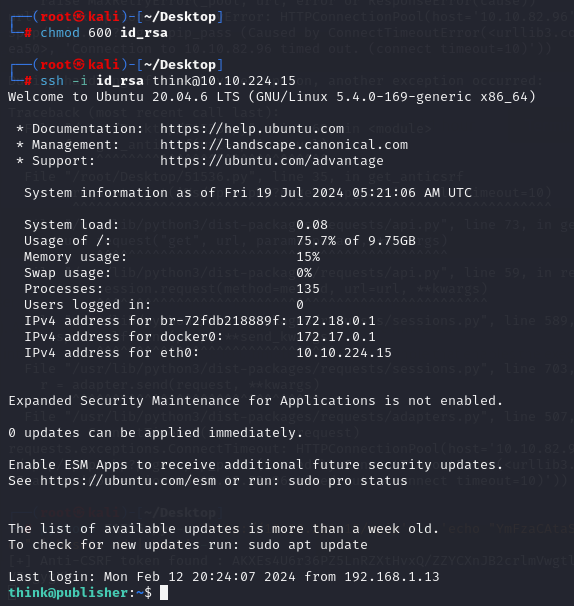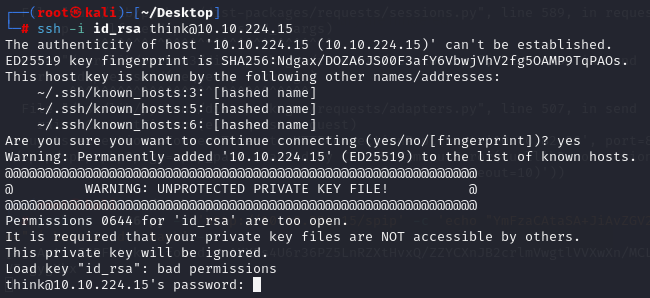 user.txt 파일과 함께있는 .ssh 폴더도 확인해보면 아래와 같이 think 사용자의 private key도 확인할 수 있다.