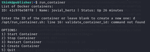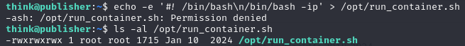 /opt/run_container.sh 쉘스크립트 파일을 수정하여 bash쉘을 실행하려 했지만 권한이 없다고 한다.