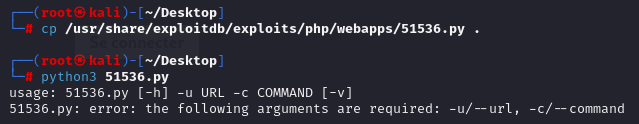 내장되어 있는 exploit 을 가져오고 사용법도 확인했다. -u 옵션을 사용해서 타겟 URL을 지정하고 실행시킬 코드를 -c 옵션 뒤에 적으면 된다.