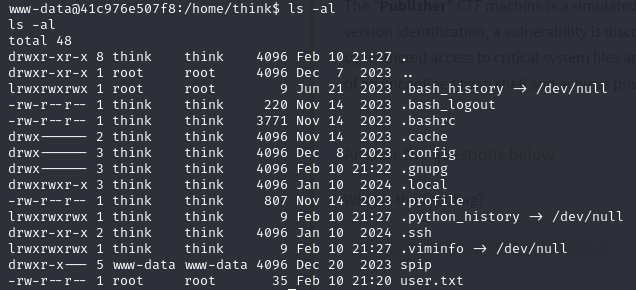 상위 디렉토리로 올라가보면 /home/think 폴더에 첫번째 flag인 user.txt 파일을 찾을 수 있다.